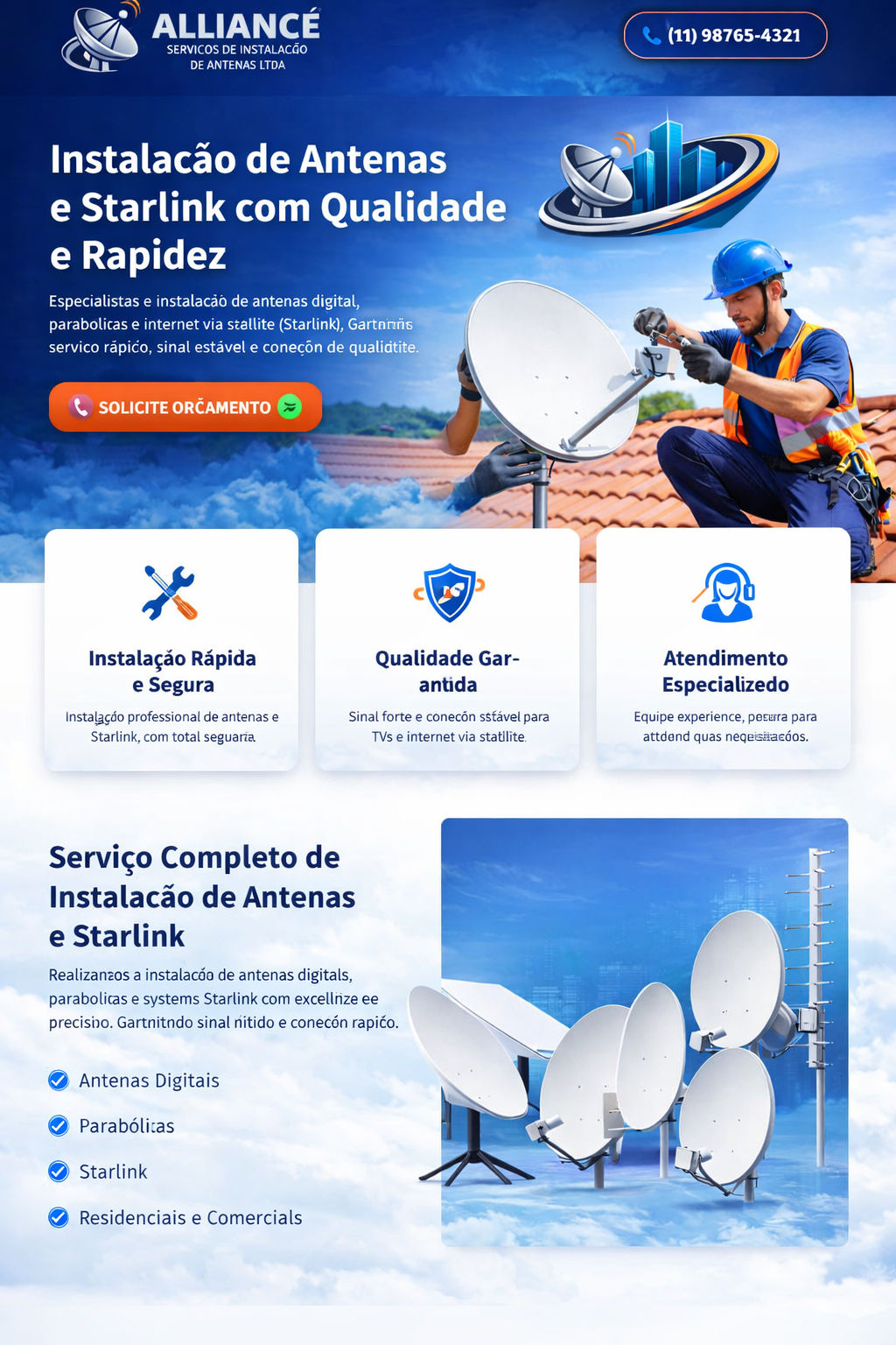 A Alliance é especialista em instalação de antenas digitais, parabólicas e sistemas de internet via satélite como Starlink. Oferecemos soluções completas para residências e empresas, garantindo sinal estável, alta qualidade e atendimento rápido.